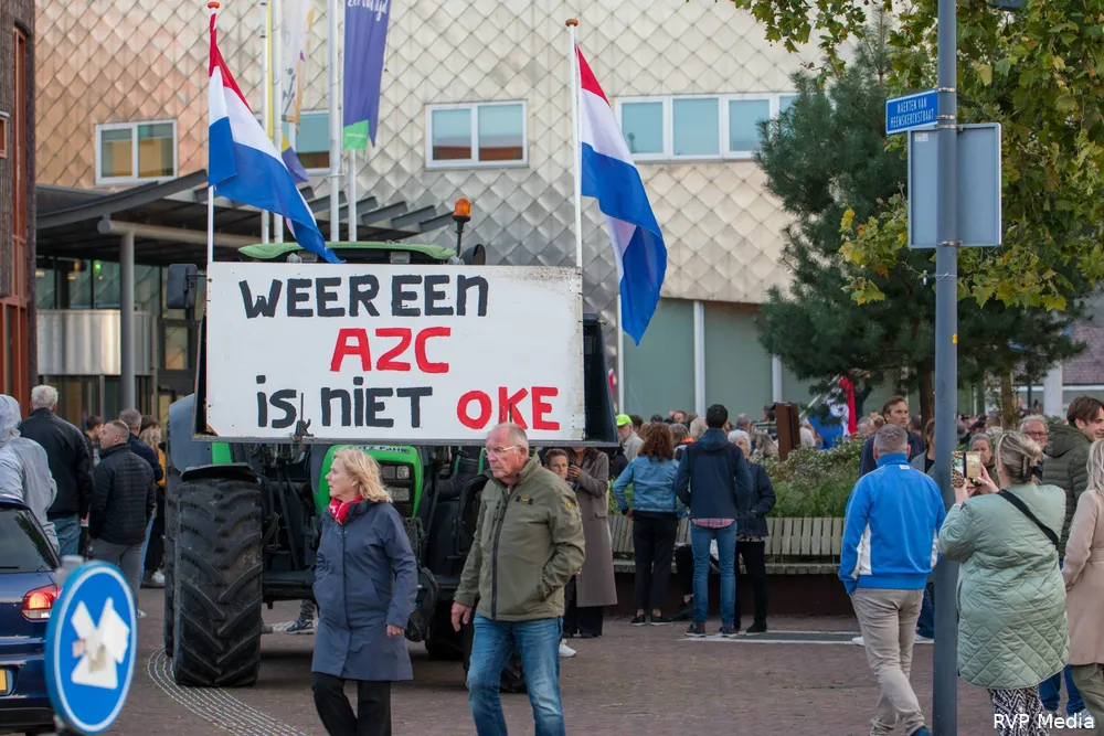 Tijdens de bijeenkomst bij het gemeentehuis werden Nederlandse vlaggen, spandoeken en protestborden getoond met teksten als ‘Nee azc’, ‘Geen draagvlak’ en ‘Weer een azc is niet oke’. Op een geparkeerde tractor was eveneens een protestleus zichtbaar.