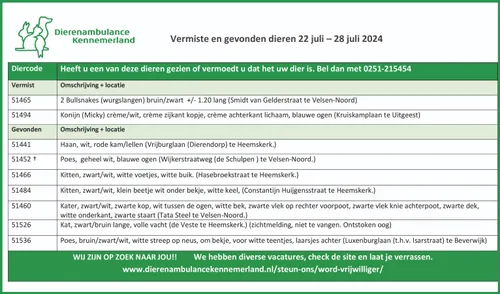 Iedere week publiceert Nieuws.nl de gevonden en vermiste dieren in en rond Beverwijk, Heemskerk, Castricum en Uitgeest op basis van de gegevens van Stichting Dierenambulance Kennemerland en Stichting Amivedi.