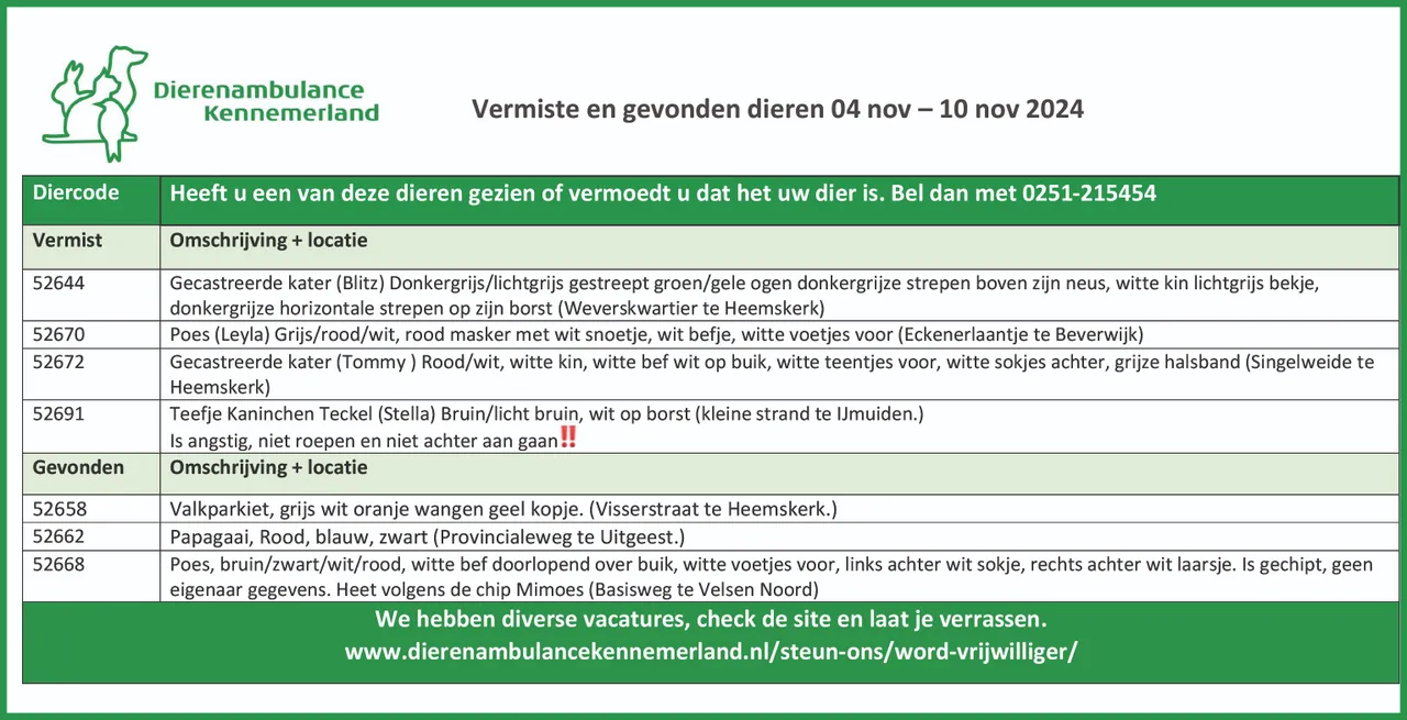 Iedere week publiceert Nieuws.nl de gevonden en vermiste dieren in en rond Beverwijk, Heemskerk, Castricum en Uitgeest op basis van de gegevens van Stichting Dierenambulance Kennemerland en Stichting Amivedi.