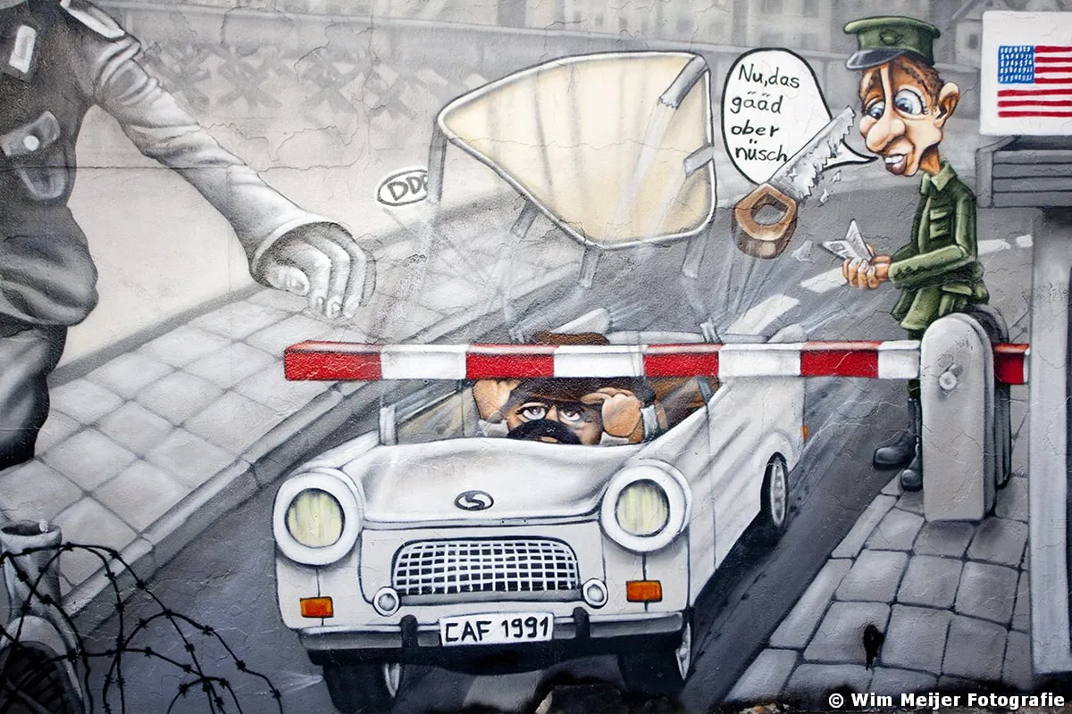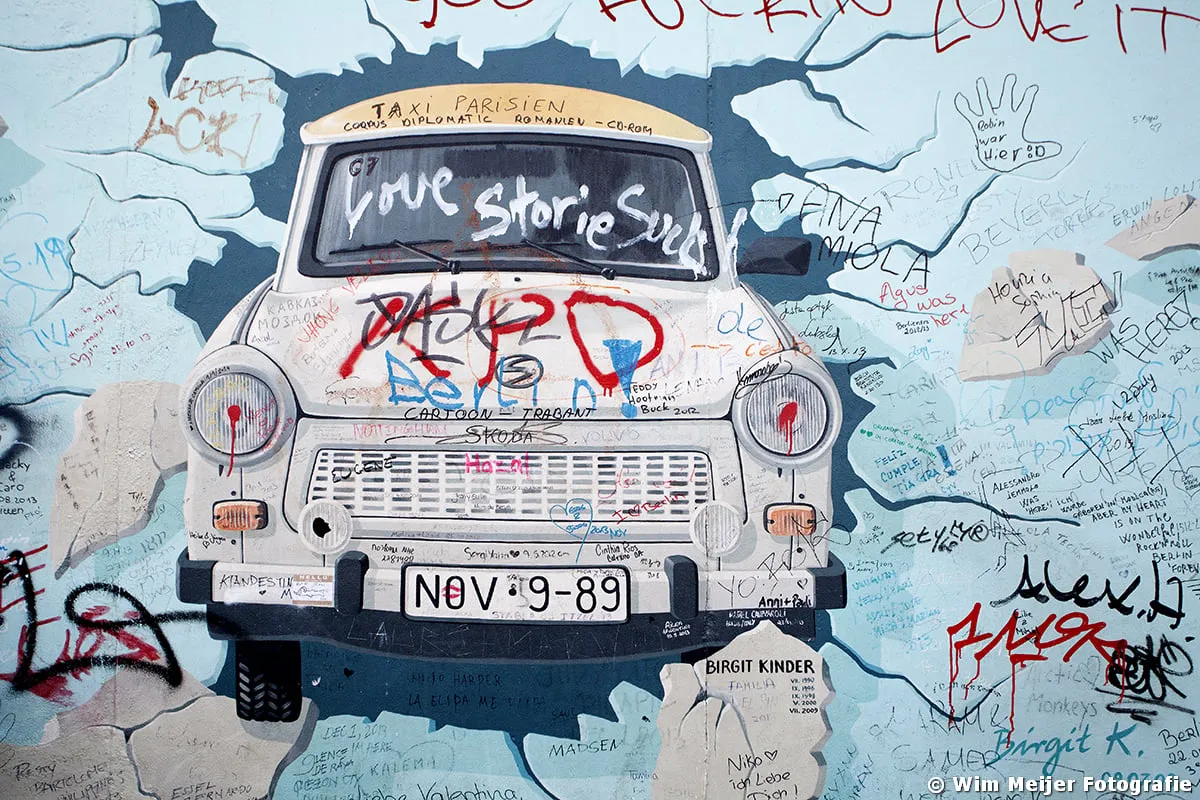 Hieronder een fotoserie van een deel van de Berlijnse Muur: de East Side Gallery , een stuk van de Berlijnse Muur met een lengte van 1.316 meter, in 1990 beschilderd door 118 kunstenaars uit 21 landen. De kunstenaars gaven in de schilderwerken hun visie op de politieke situatie in het Berlijn van 1989/1990. Inmiddels is de Side Gallery de grootste permanente openluchttentoonstelling ter wereld en is een verzoek ingediend om het op te nemen op de werelderfgoedlijst van UNESCO.