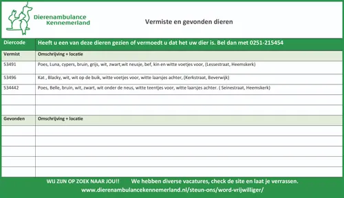 en vermiste dieren in en rond Beverwijk, Heemskerk, Castricum en Uitgeest op